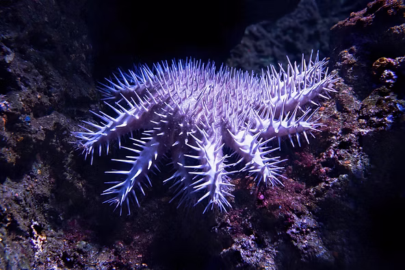 Crown-of-thorns starfish threaten coral reefs with destructive outbreaks, regeneration, and complex predator-prey interactions.